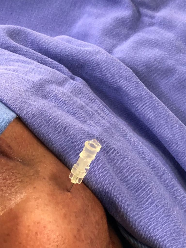 A rizotomia, como demonstrada na imagem, é realizada através de uma punção com agulha na face guiada por raio X. Em seguida é realizada lesão do nervo trigêmeo através de calor, compressão ou química. É um procedimento seguro e com uma taxa de melhora imediata da dor em torno de 90%.